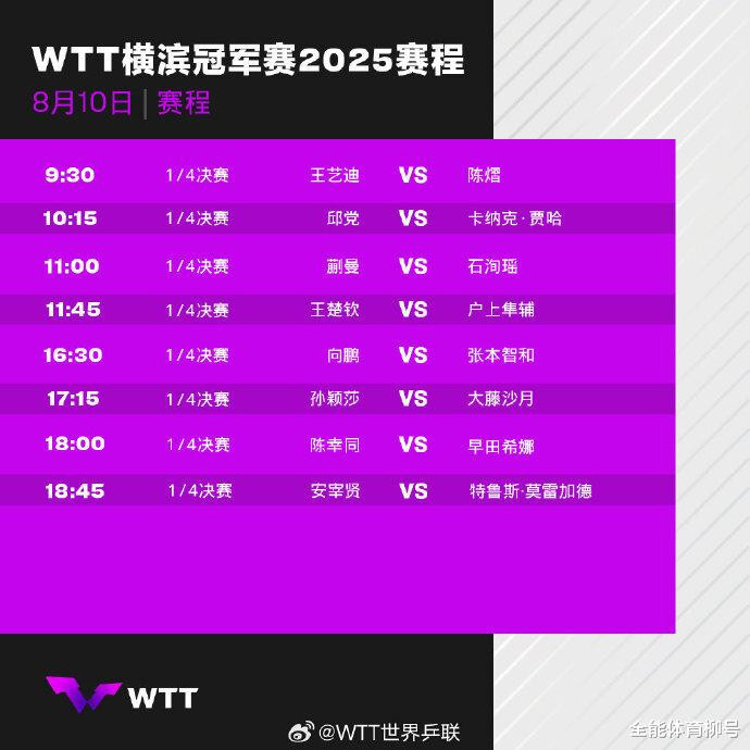 北京时间8月10日消息,2025年WTT横滨冠军赛展开第四个比赛日的争夺,CCTV5直播比赛实况。女子单打方面,世界第一“小魔王”孙颖莎,携手王艺迪、陈幸同、陈熠、蒯曼、石洵瑶等6位队友出战。其中,孙颖莎在17:15迎战日本险胜大藤沙月,陈幸同在18:00迎战日本一姐早田希娜。